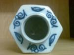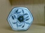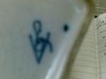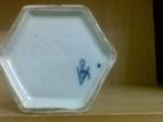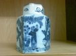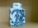 PS: The piece is hexagonal and is just over 9 cms high and about 8 cms at the widest diameter. It is painted in the chinese style including a figure of a woman in a sylvian setting (I believe she's might be refered to as "Long Eliza") and on the opposite side a figure of a monk/priest is depicted. From what I have found out this could date the piece from the mid 17th to the late 18th century. Glaze, fritting, crackle, biscuit colour etc! all seem to fit with a piece of that period. The lid might not match the body of the piece as the blue seems darker though it is hexagonal and employs the same designs and artistically seems very similar to the painting on the body. Can the colour be different due to the lid being fired at a different time? These are questions I have yet to discover answers but probably best to start with identifying the mark... so any help with that would be most appreciated.